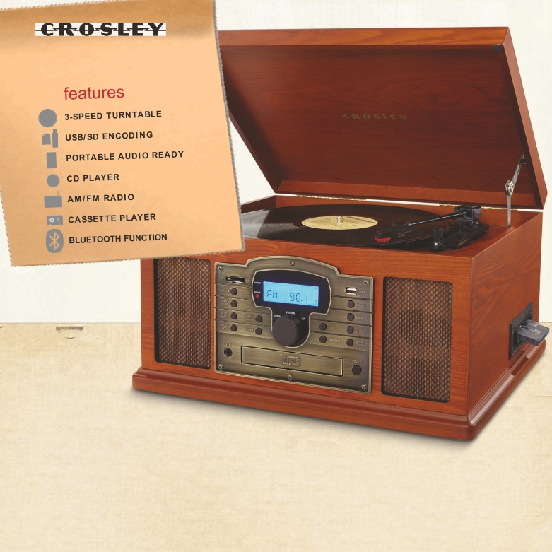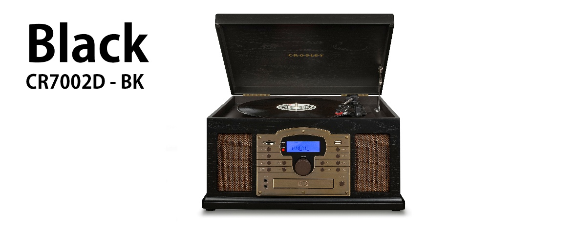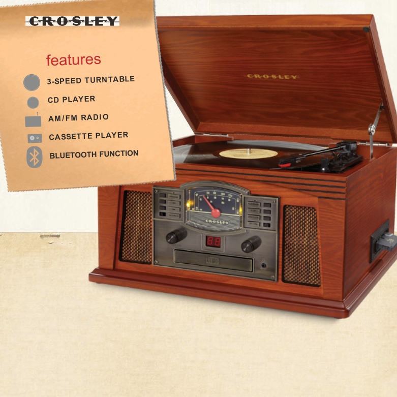 Tune in the nostalgic Crosley Lancaster to hear music as it should be heard. An antique-styled cabinet with handsome grillwork details and aviator dial houses a CD player, an AM/FM radio, Bluetooth function, and a three-speed record player for all of those classic vinyls.