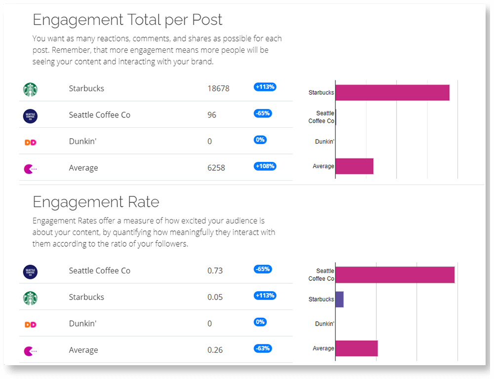 CompEat generates an analysis report in seconds, giving you a Facebook competitive analysis tool that provides you with real-time, data-driven insights about key insights of your and your competitor’s Facebook pages, including comparative information about posts, engagement, and audiences.