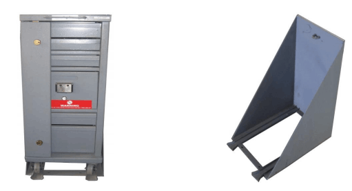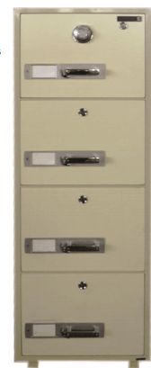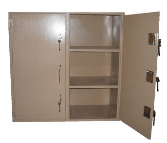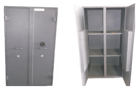Body constructed out of 1.6 mild steel consisting of 6 drawers; 3 RD Drawer deposit drawer and 4th draw fitted with time delay and releasing mechanism 1 x side flap fitted with 2 key locks (top teller and bottom master)