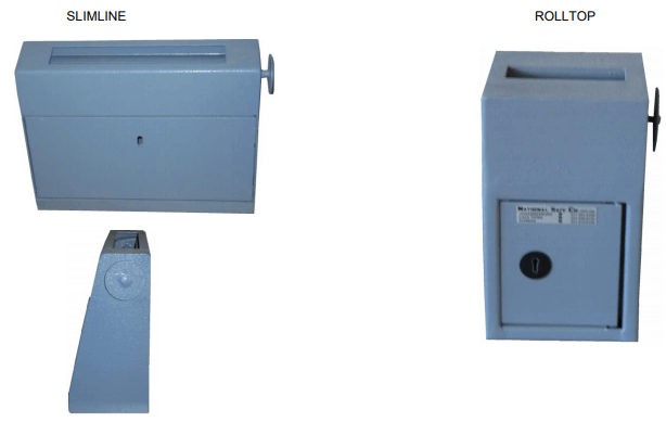 National Deposit Safes are designed to provide security against hold-ups and robberries. No tins, pouches or other containers are required (but may be used), cash and individual single notes may be deposited as required without waiting to fill separate containers. A non-return device is fitted to the deposit mechanism to prevent “fishing out”. The inner door is secured by a 7-lever unpickable safe lock